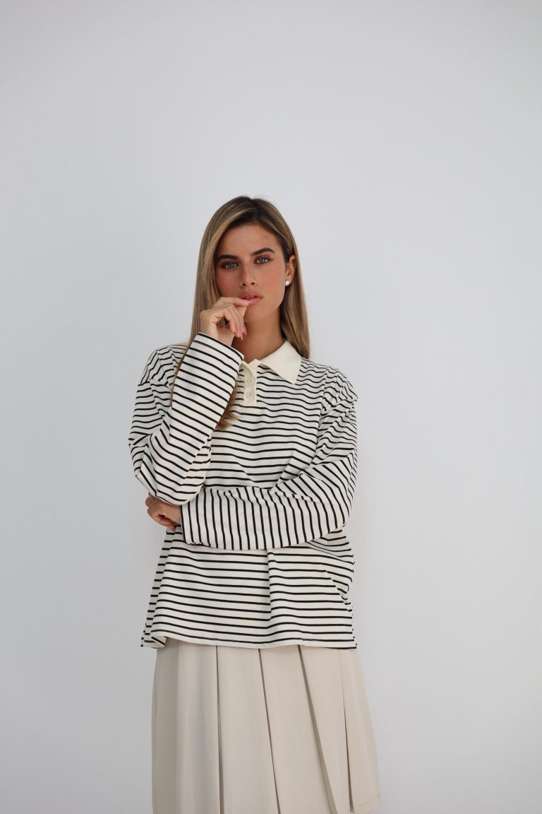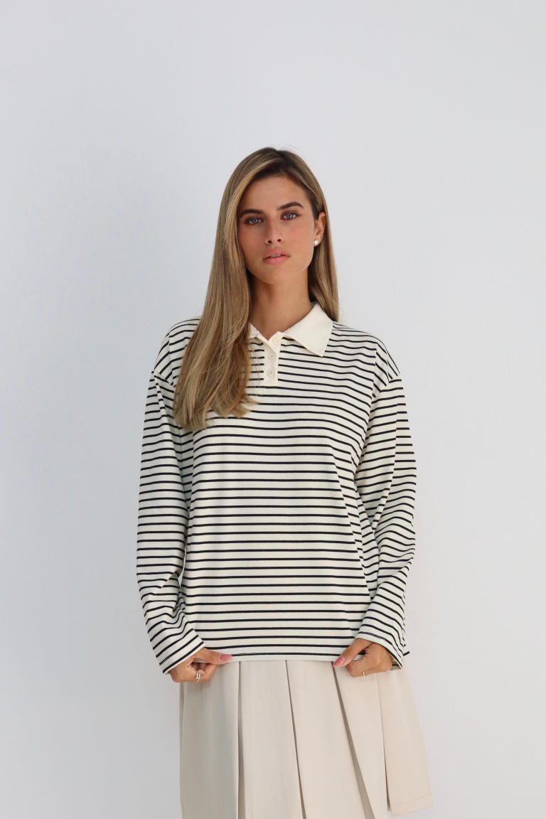 חולצת צווארון פסים מבד לקוסט שחור-לבן
