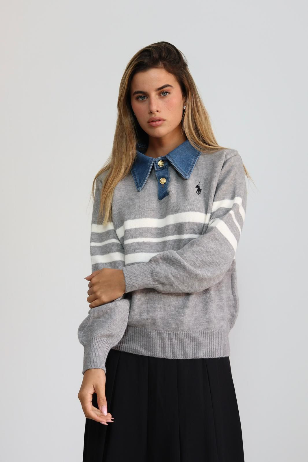 חולצת סריג איכותית ונעימה למגע, בשילוב צווארון ג׳ינס אופנתי שמוסיף טאץ’ ייחודי וצעיר.