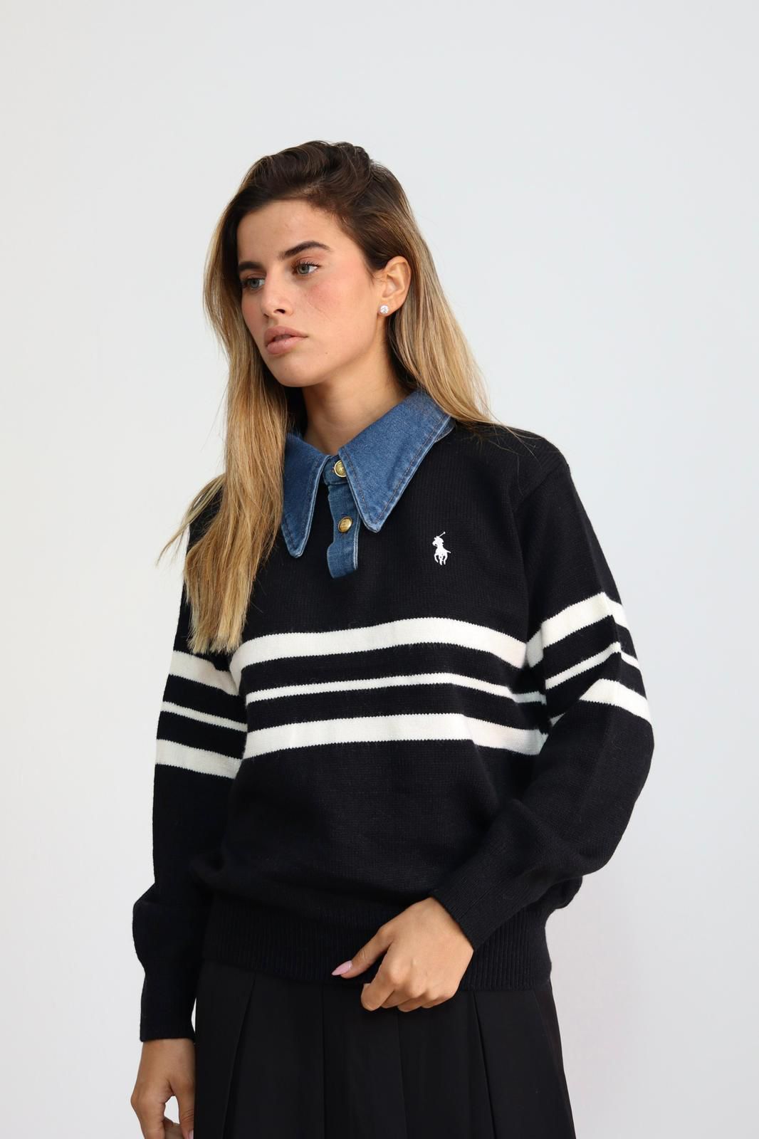 חולצת סריג איכותית ונעימה למגע, בשילוב צווארון ג׳ינס אופנתי שמוסיף טאץ’ ייחודי וצעיר.