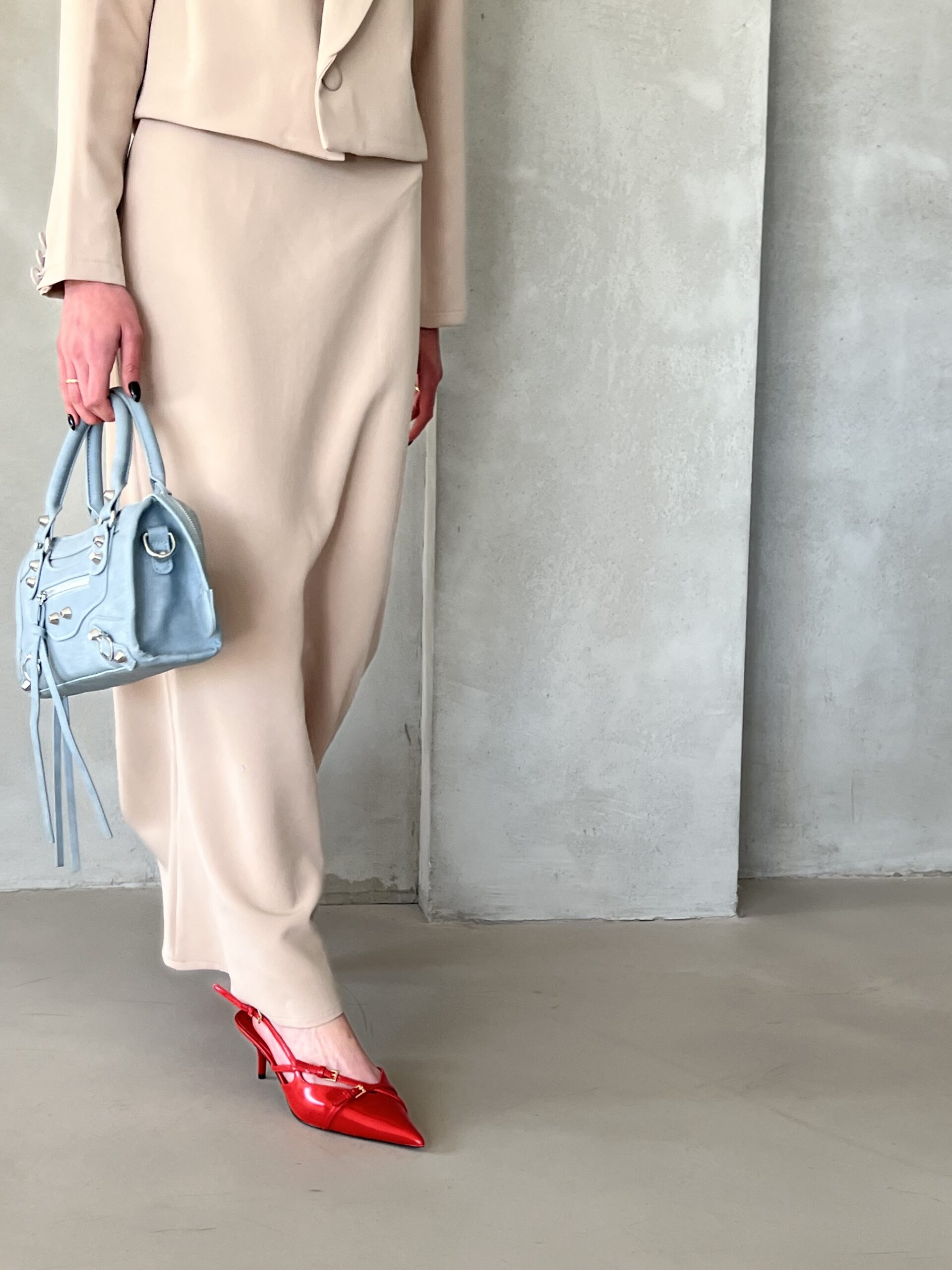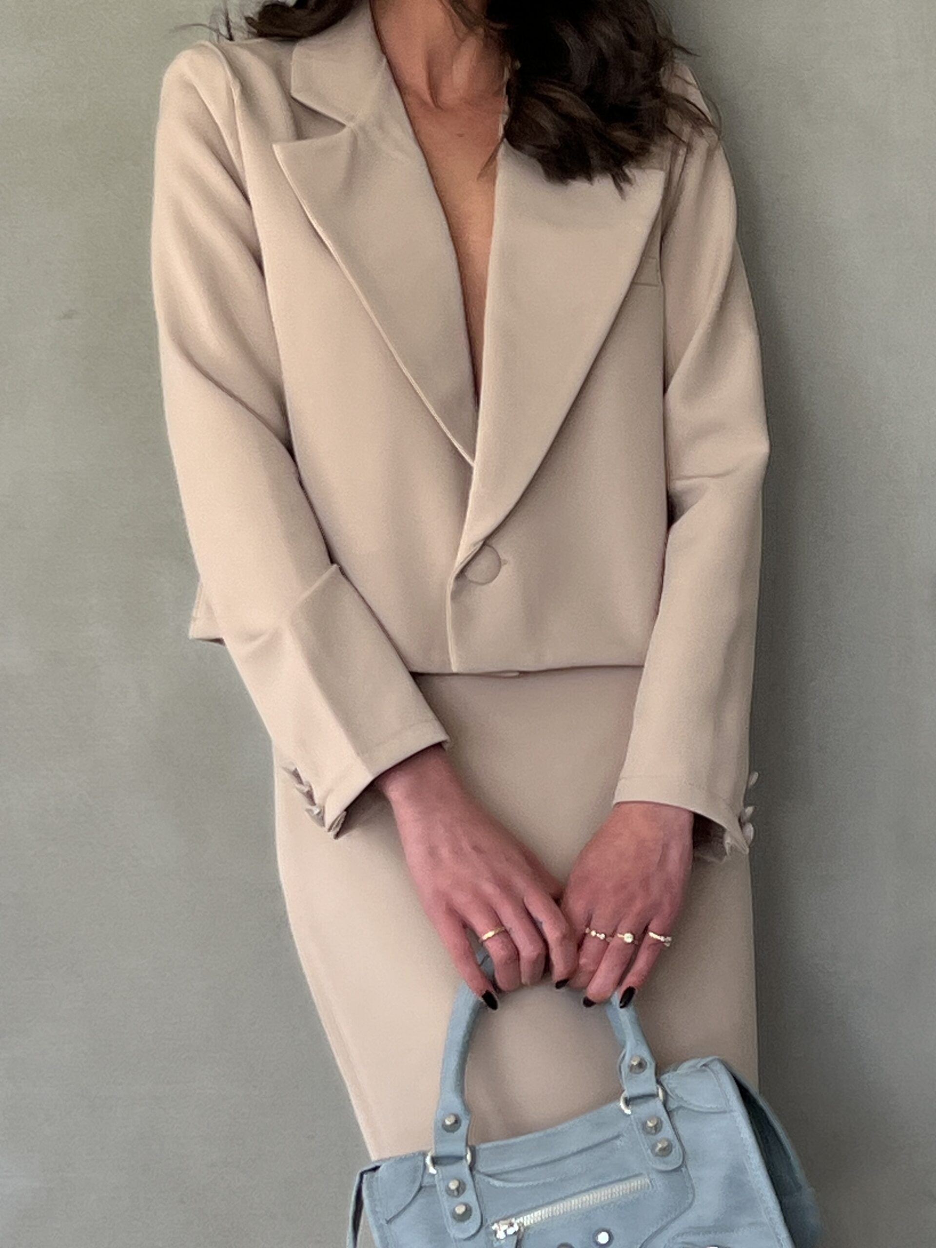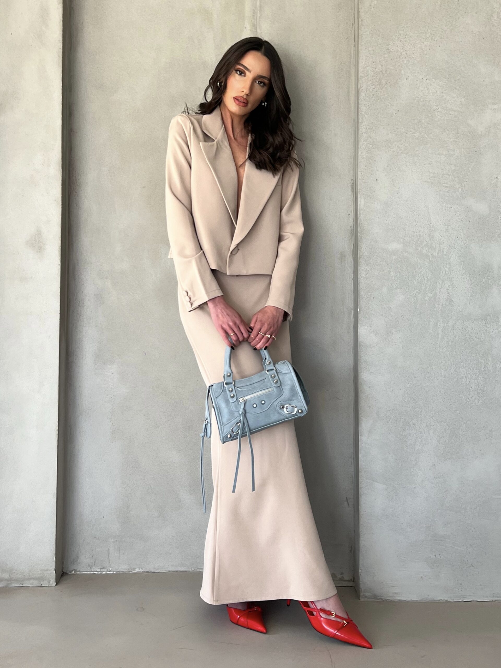 חליפת שני חלקים, ג׳קט מחויט עם שרוולים ארוכים וחצאית ארוכה עם רוכסן אחורי.