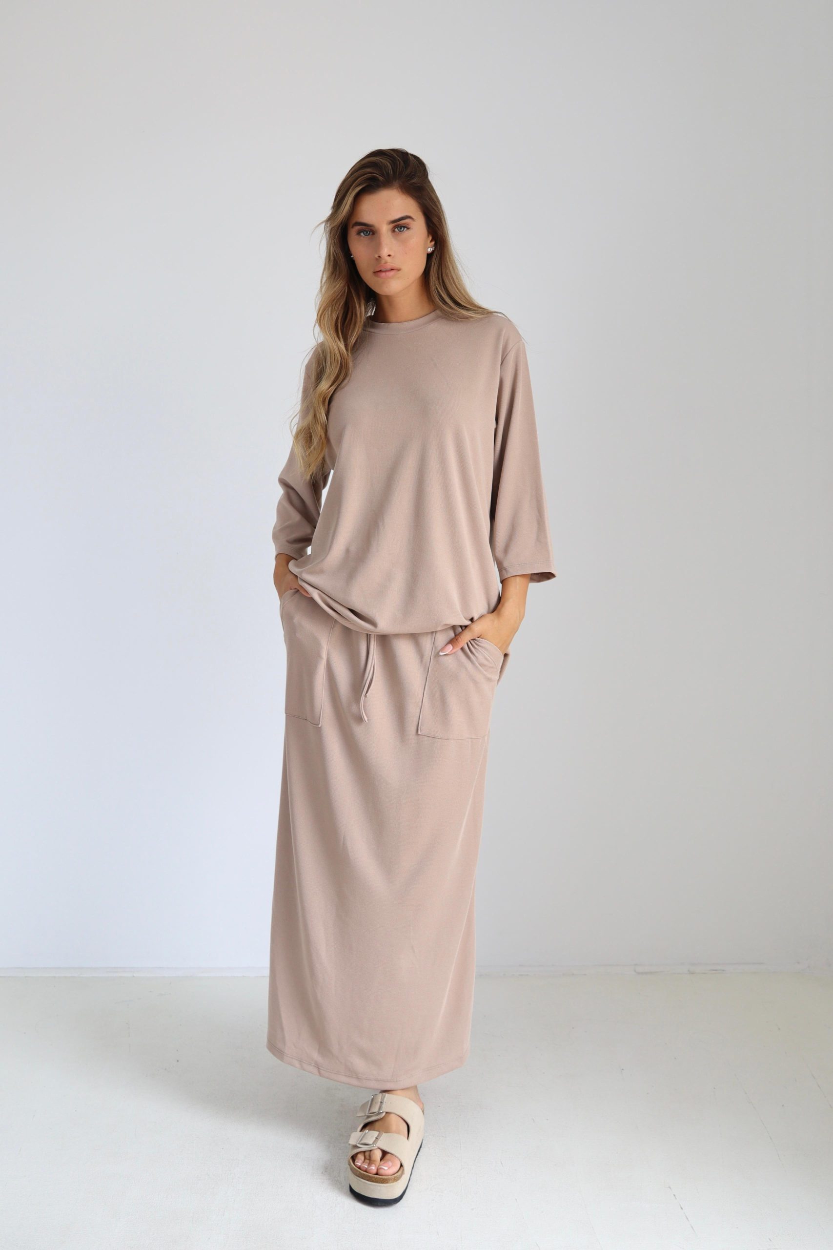 שרוולים 3/4 משולבת בחצאית ארוכה עם כיסים