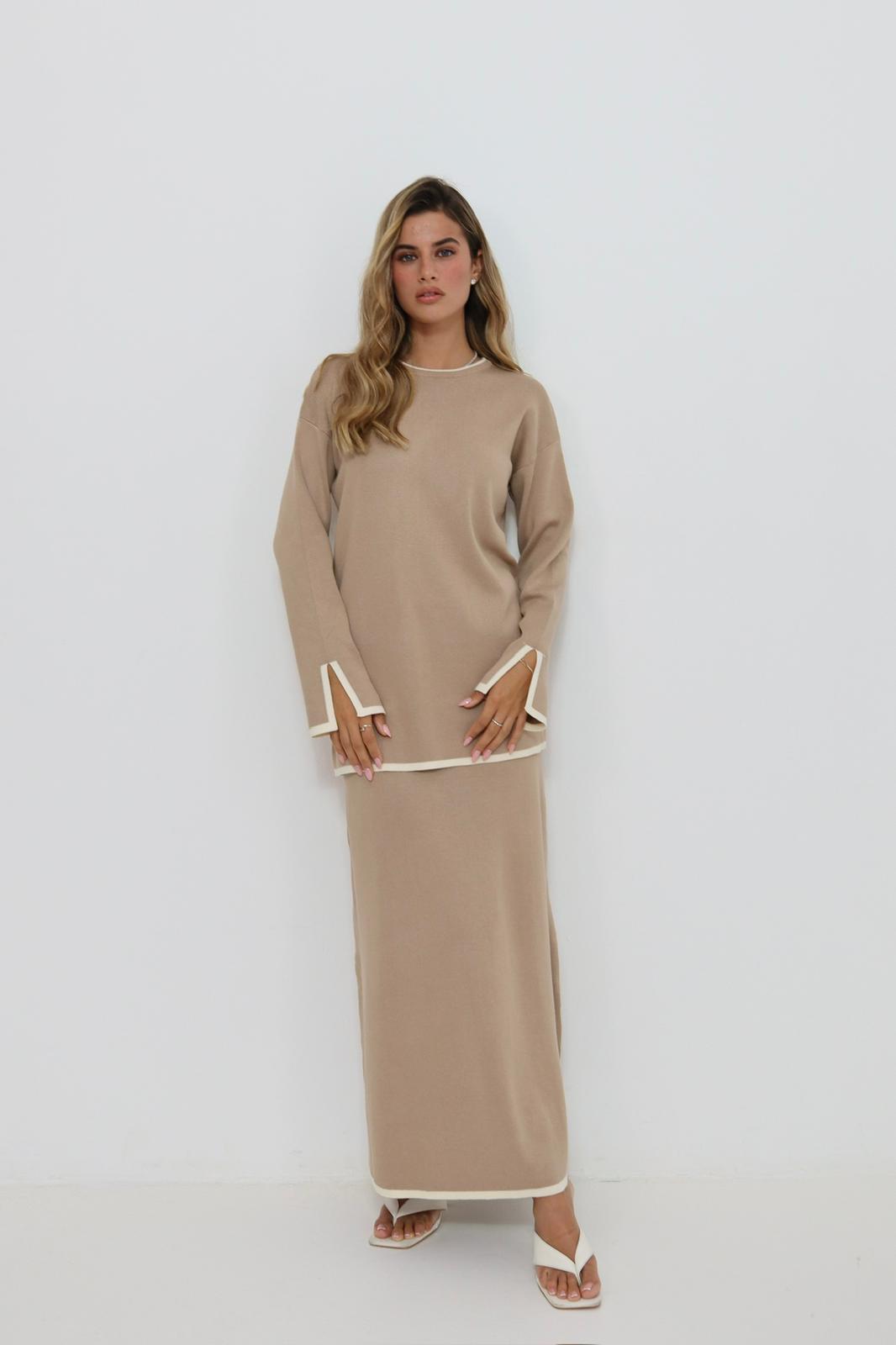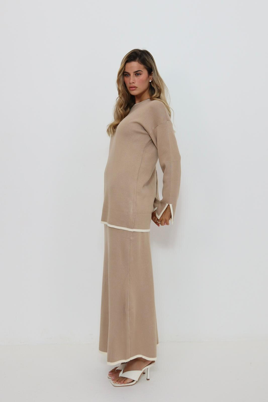 / חליפת סריג בז' פס לבן