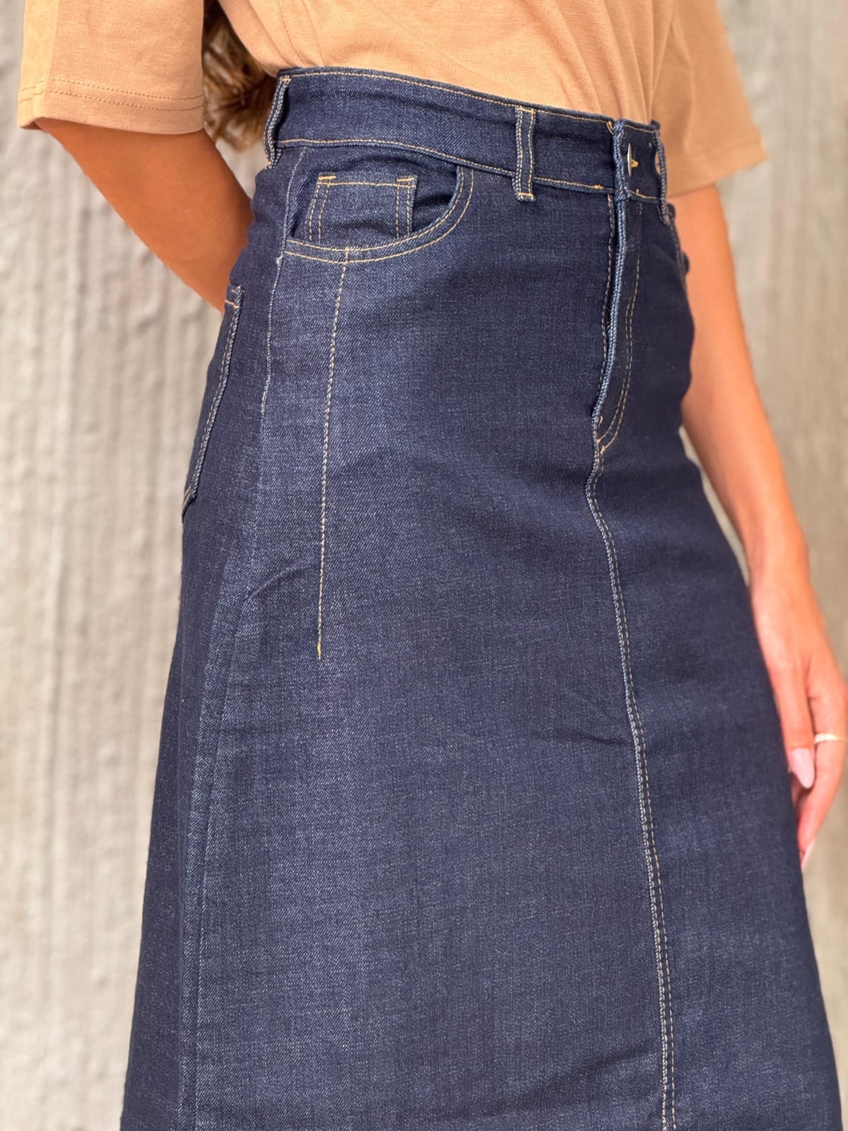 חצאית ג׳ינס בגזרת פעמון מחמיאה, עם קו תפר צדדי שמדגיש את הצורה וצריבה עדינה למראה שיקי ואלגנטי.
