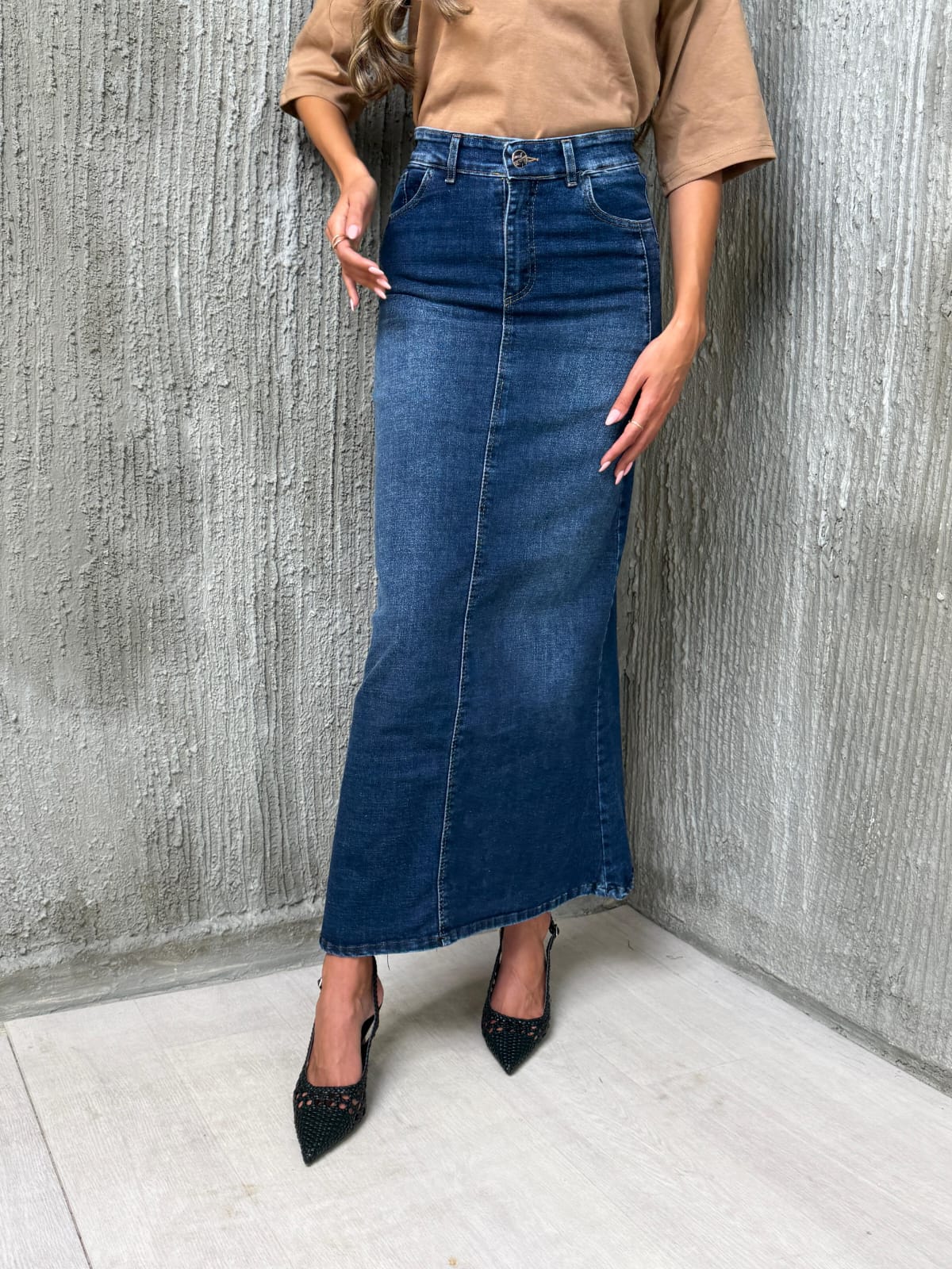 חצאית ג׳ינס בגזרת פעמון מחמיאה, עם קו תפר צדדי שמדגיש את הצורה וצריבה עדינה למראה שיקי ואלגנטי.