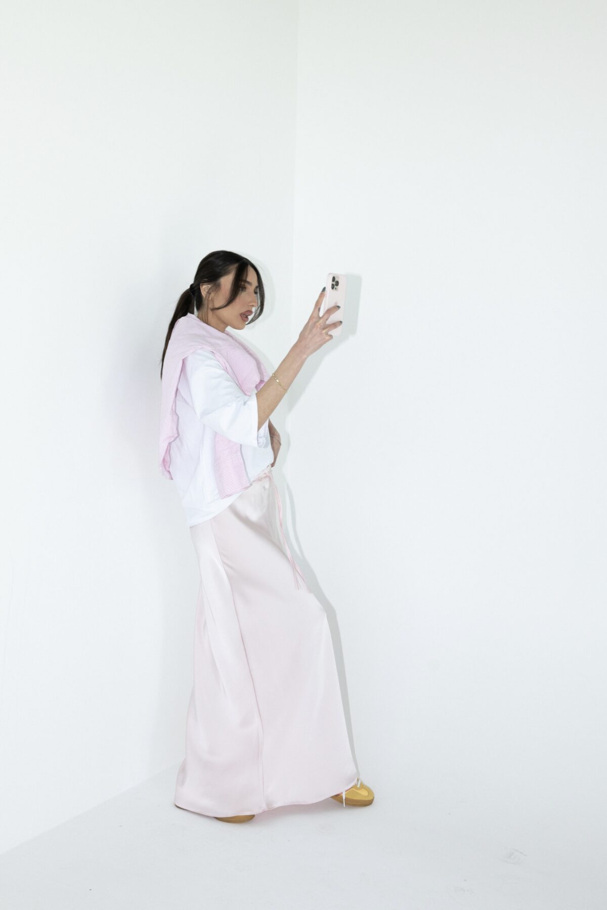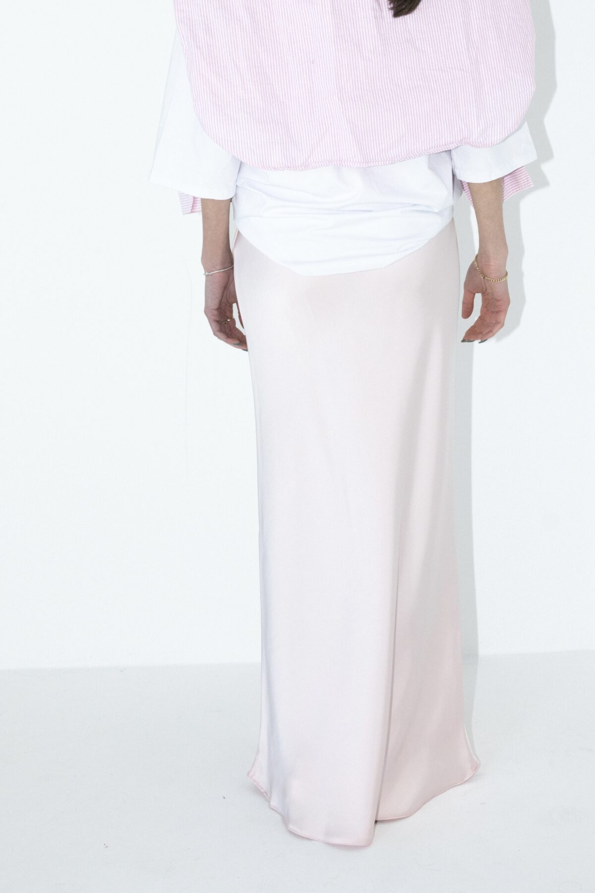 חצאית מושלמת מבד סאטן משי נשפכת על הגוף למראה קלאסי ומדהים וגומי במותן.
