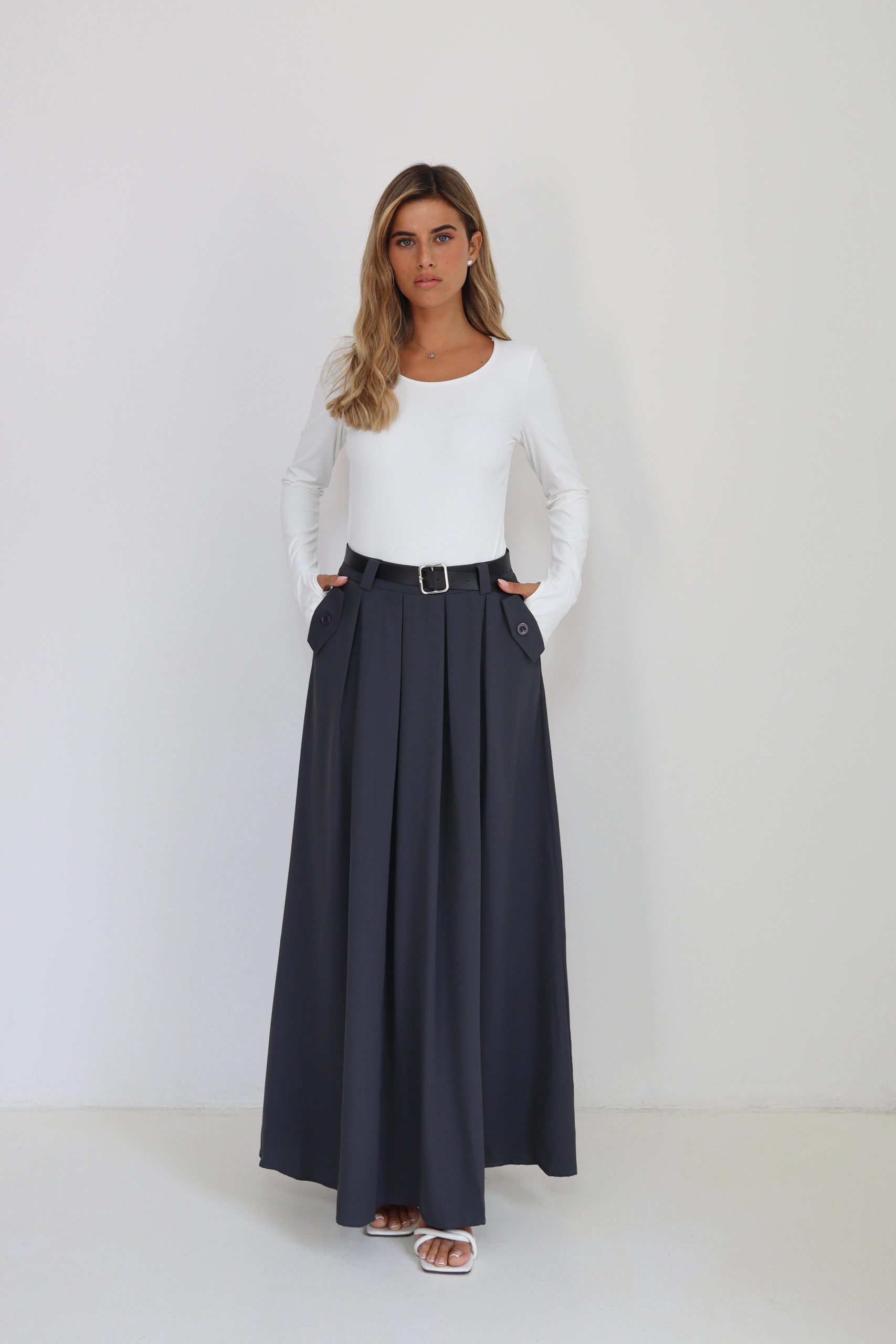 חצאית בד קלילה ונשפכת בגזרה בובתית ונשית, משולבת כיסים נוחים וחגורה תואמת שמוסיפים גם פרקטיות וגם סטייל. פריט מושלם ללוק יומיומי עם טאץ׳ אופנתי ומלא שיק