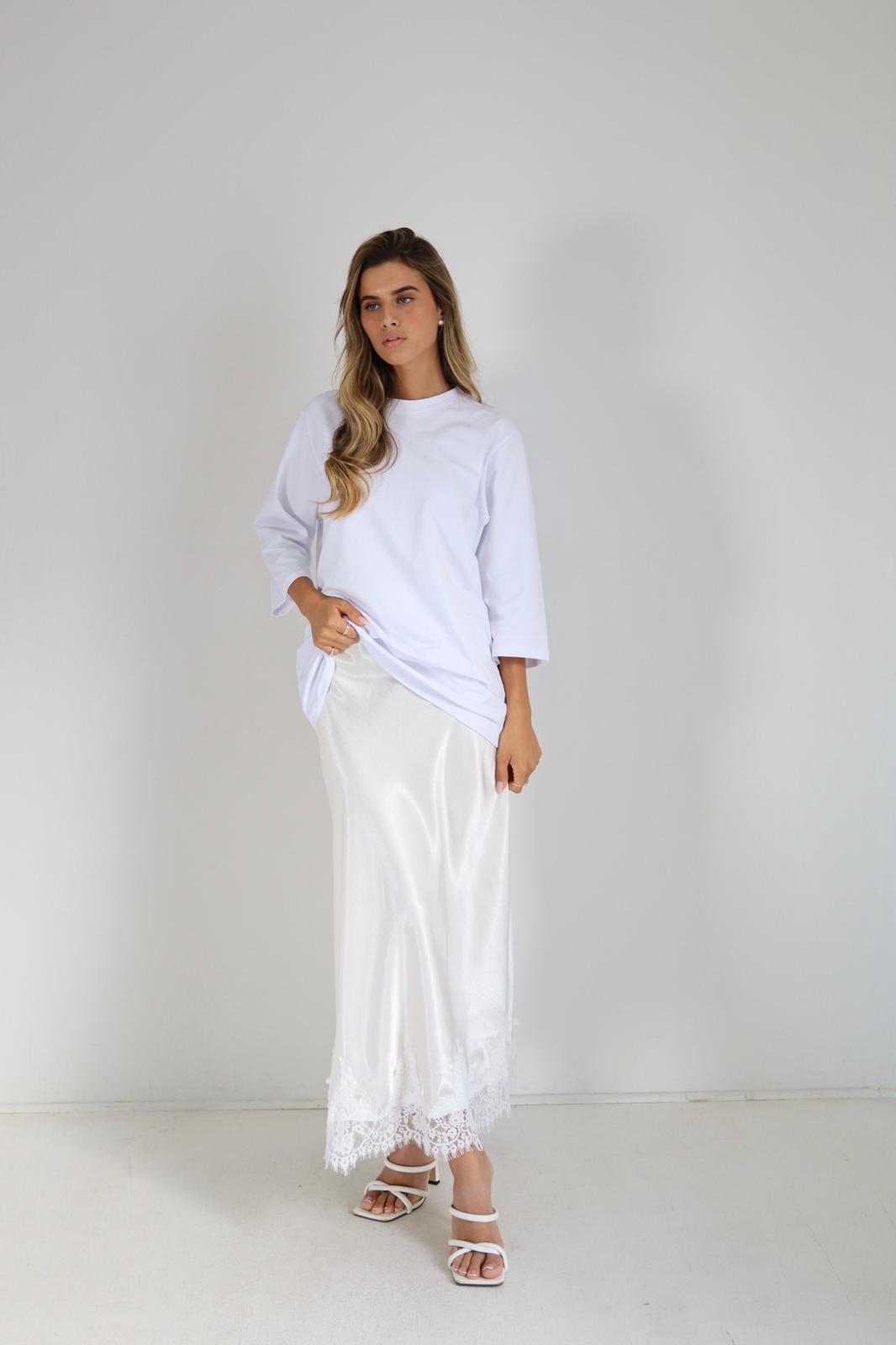 חצאית מושלמת מבד סאטן משי נשפכת על הגוף למראה קלאסי ומדהים עם סיומת תחרה