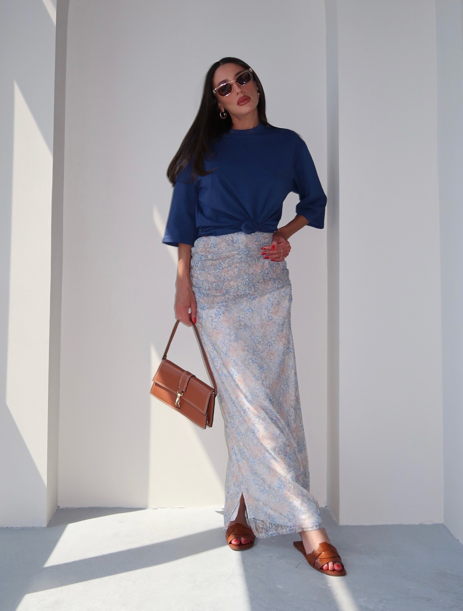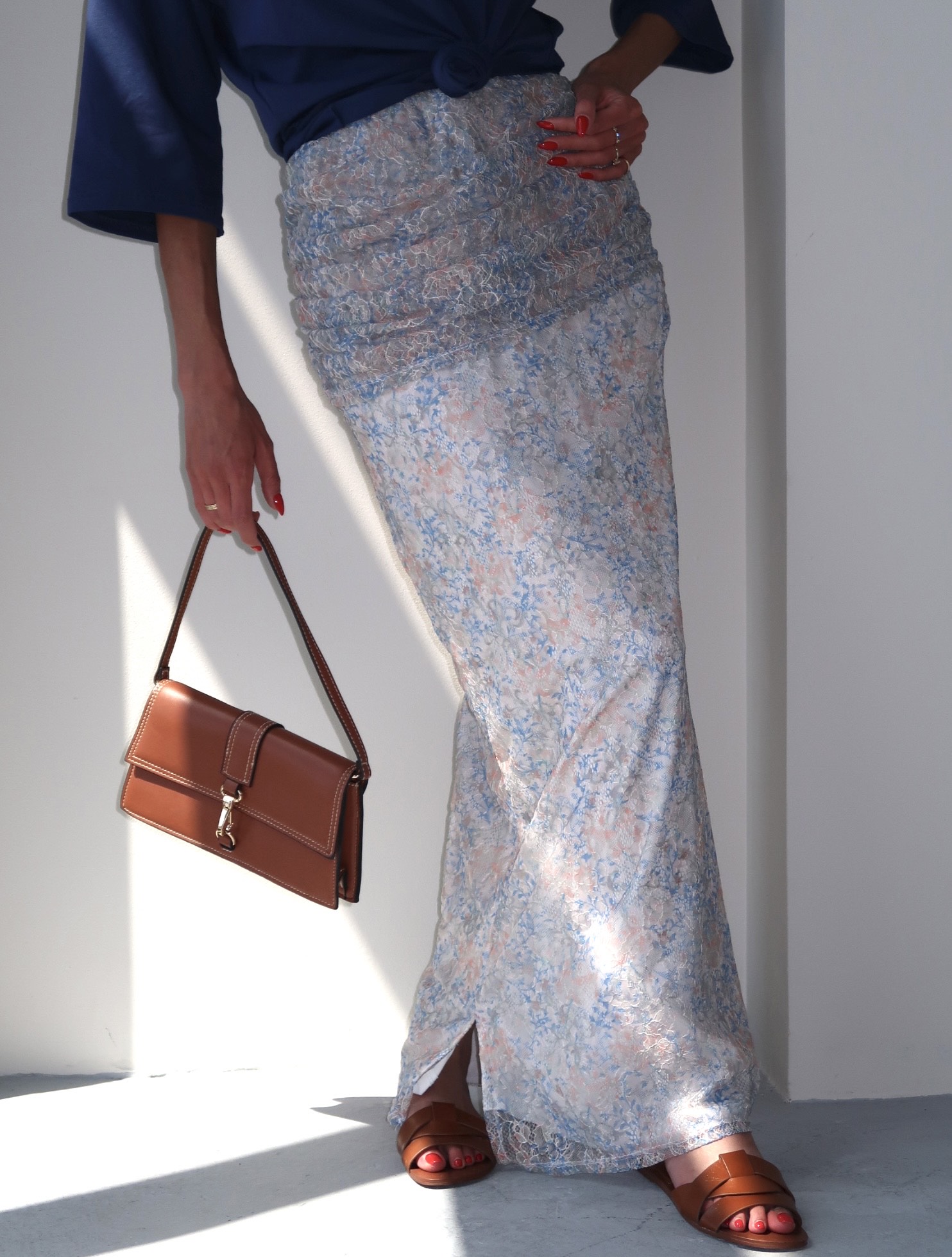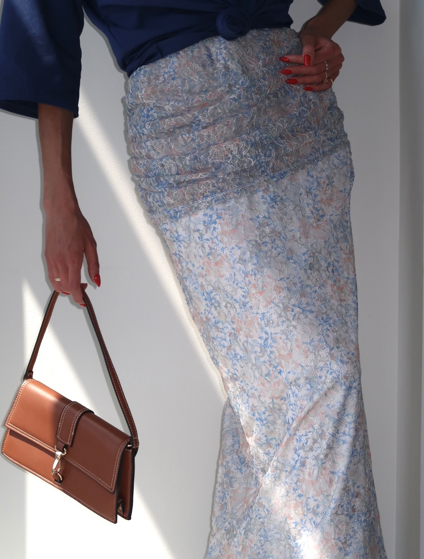 חצאית מבד תחרה עם בטנה מחוברת, כיווצים בחלק העליון של החצאית למראה צר וקלאסי, גומי למעלה ושתי שסעים קטנים בצידי החצאית.